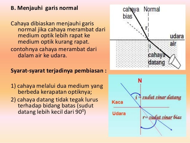 Dalam rangka untuk menjelaskan sifat-sifat cahaya, seperti refleksi dan refraksi, Descartes mengusulkan apa yang sekarang tampaknya menjadi model mekanik yang agak artifisial. Ia membandingkan perilaku cahaya ketika mengenai permukaan (misalnya, antarmuka antara dua medium seperti air dan kaca) dengan sebuah bola tenis. Jika bola tenis pemogokan permukaan yang keras datar sempurna itu tercermin elastis sedemikian rupa sehingga sudut datang sama dengan sudut refleksi (Gambar 11. 1) 3 Gambar 1 Pantulan bola, menunjukkan sudut datang sama dengan sudut pantul 4 Untuk menjelaskan pembiasan cahaya, Descartes memodelkan kasus bola tenis mengenai kain, 'yang kain itu tenunannya begitu lemah dan longgar sehingga bola tersebut memiliki kekuatan untuk merobek dan untuk lolos sepenuhnya melalui kain itu, sedangkan kerugian hanya dibagian dari kecepatannya. 'Jika komponen kecepatan tegak lurus bola ke kain berkurang tetapi paralel komponen untuk kain tetap tidak berubah., bola dibelokkan menjauh dari normal. Jika komponen tegak lurus kecepatan bola terhadap kain berkurang tetapi komponen yang paralelnya tetap tidak berubah, bola dibelokkan jauh dari normal (lihat Gambar. Gambar 2 Pembiasan (bola dibelokan menjauh normal) 5 Gambar 11.3 Pembiasan (bola dibelokkan mendekati normal) 6 Gambar 3 a) Pembiasan menuju medium dengan kecepatan melemah, b) pembiasan menuju medium dengan kecapatan meninggi.